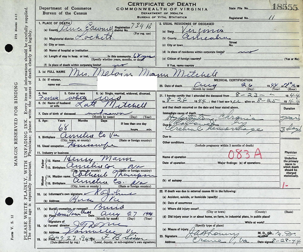 - [S916] Melvin Mann Mitchell, Certificate of Death no. 18555 (1944), Department of Health, Bureau of Vital Statistics.