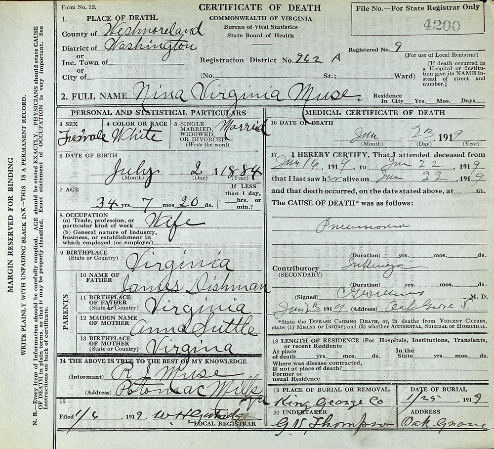- [S922] Nina Virginia Muse, Certificate of Death no. 4200 (1919), Department of Health, Bureau of Vital Statistics.