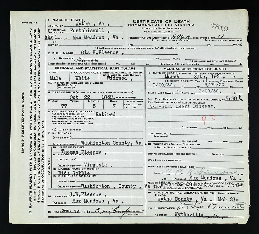 - [S923] Ota H. Fleenor, Certificate of Death no. 7819 (1930), Department of Health, Bureau of Vital Statistics.