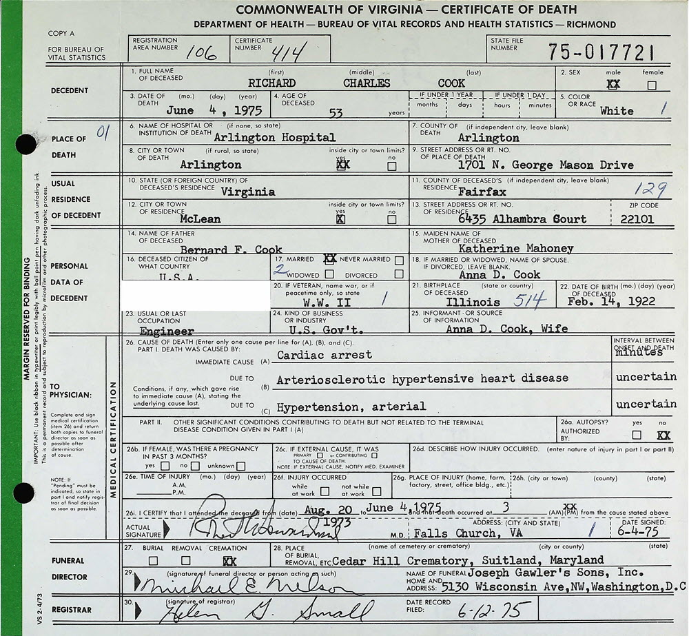 - [S926] Richard Charles Cook, Certificate of Death no. 75-017721 (1975), Department of Health, Bureau of Vital Statistics.