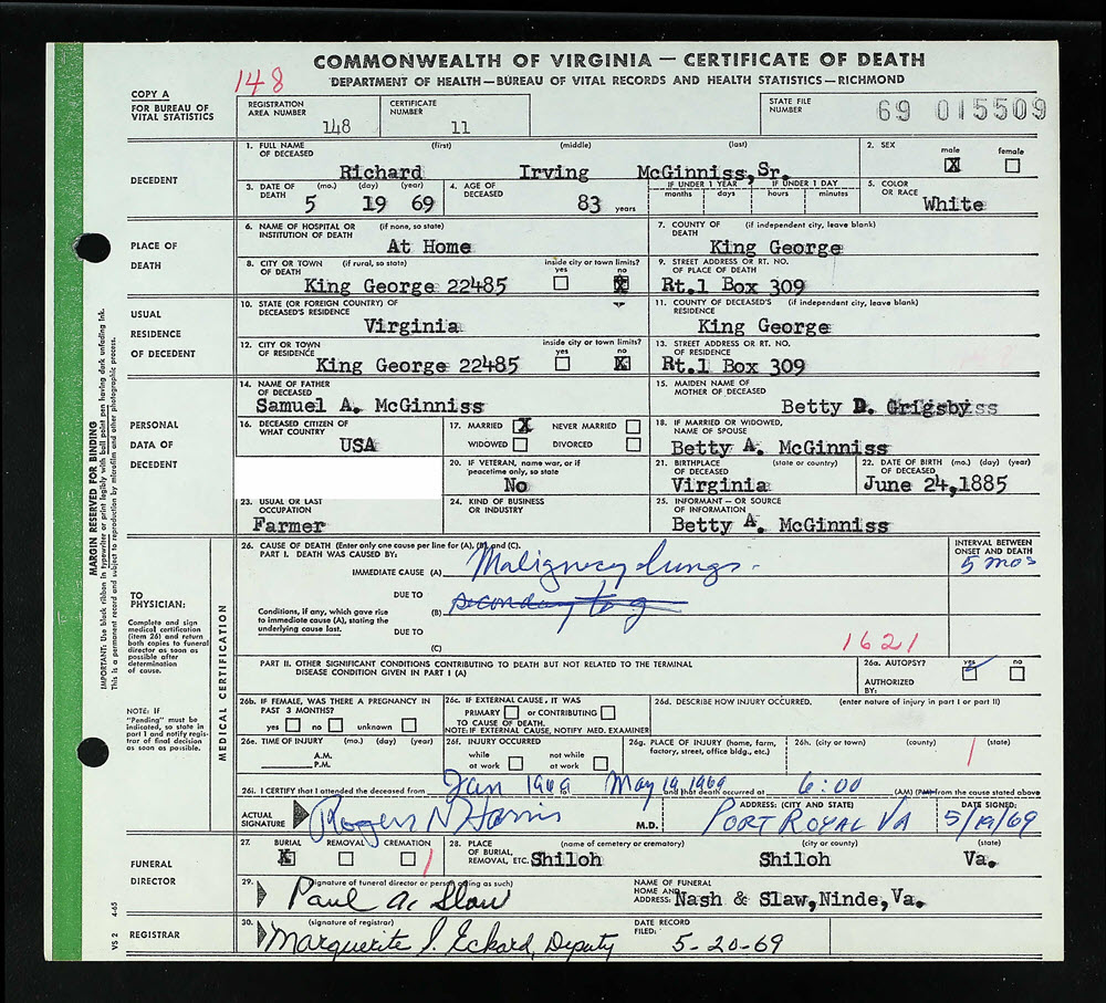 - [S927] Richard Irving McGinniss, Sr., Certificate of Death no. 69-015509 (1969), Department of Health, Bureau of Vital Statistics.