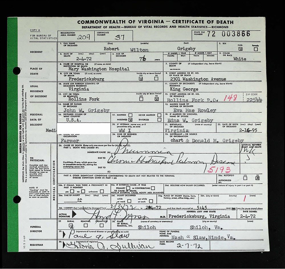 - [S932] Robert Wilton Grigsby, Certificate of Death no. 72-003866 (1972), Department of Health, Bureau of Vital Statistics.