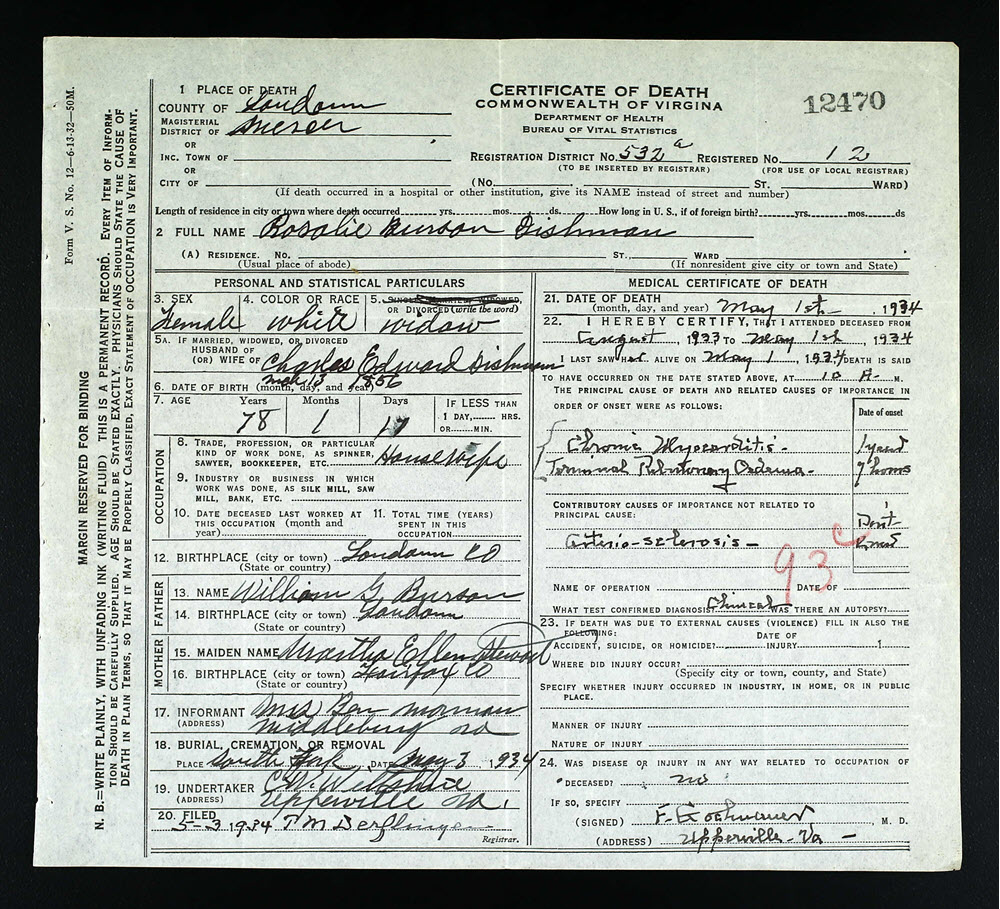 - [S933] Rosalie Burson Dishman, Certificate of Death no. 12470 (1934), Department of Health, Bureau of Vital Statistics.