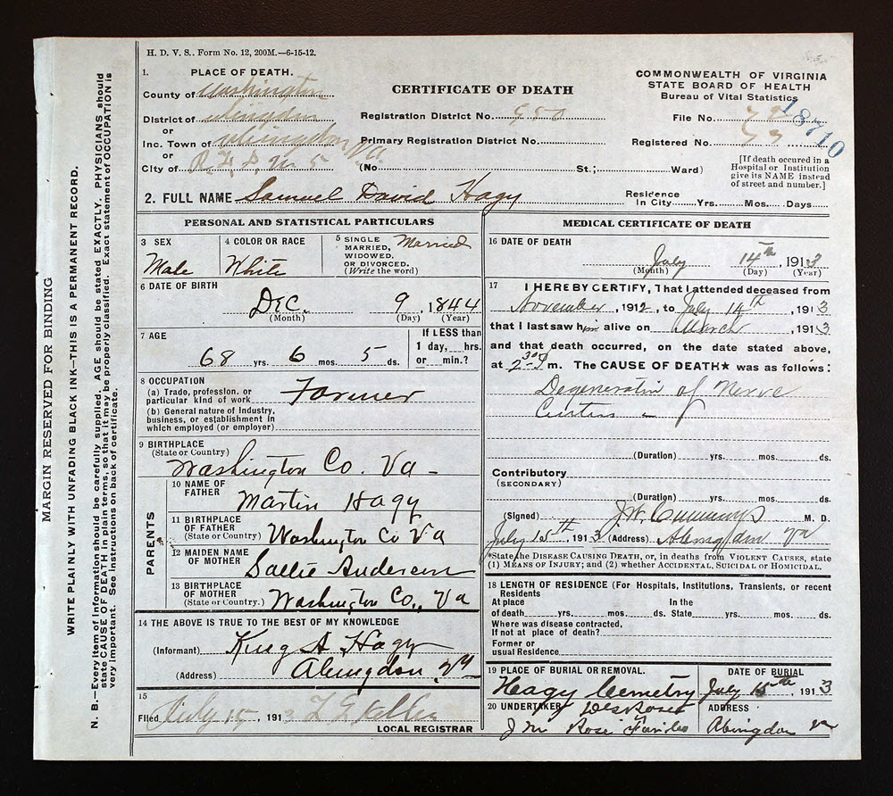 - [S939] Samuel David Hagy, Certificate of Death no. 18710 (1913), Department of Health, Bureau of Vital Statistics.