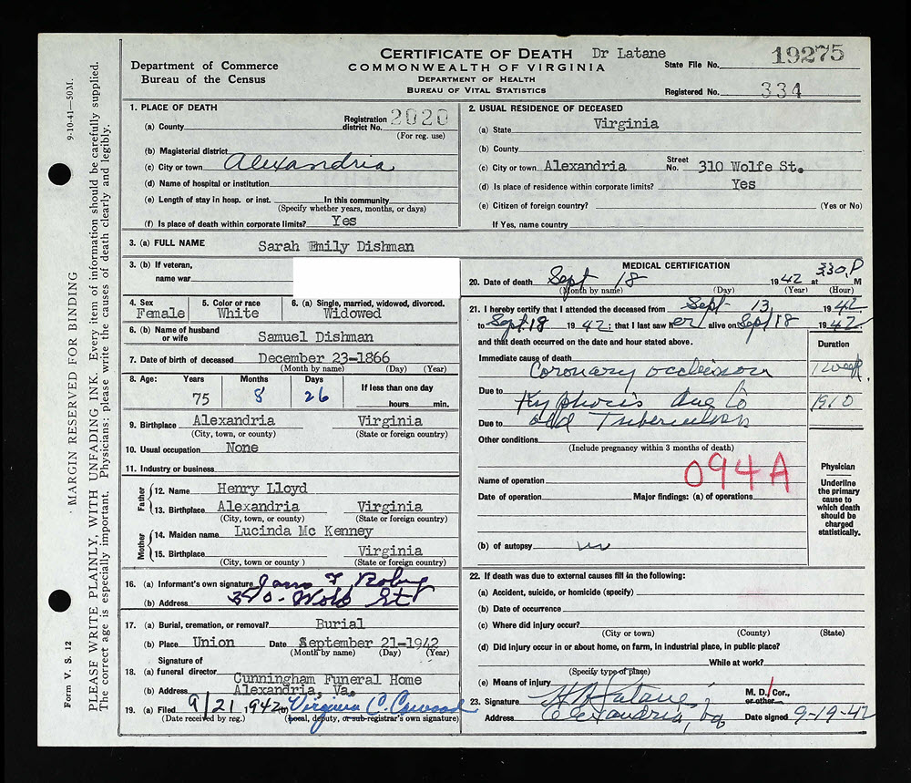 - [S940] Sarah Emily Dishman, Certificate of Death no. 19275 (1942), Department of Health, Bureau of Vital Statistics.