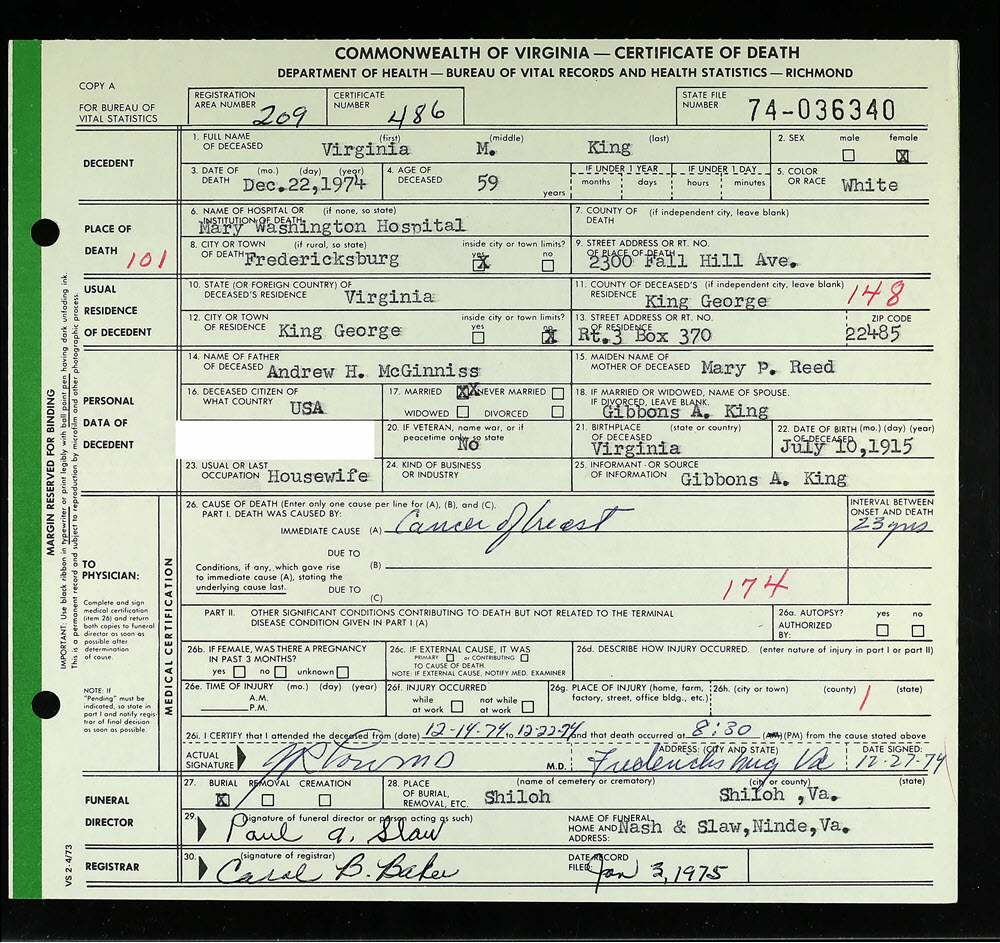 - [S946] Virginia M. King, Certificate of Death no. 74-036340 (1975), Department of Health, Bureau of Vital Statistics.