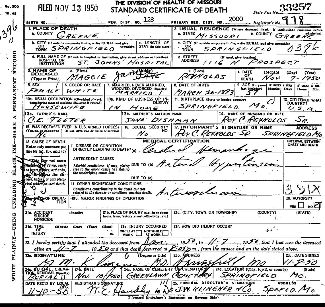 - [S965] Maggie James Reynolds, Certificate of Death no. 33257 (1950), Board of Health, Bureau of Vital Statistics.