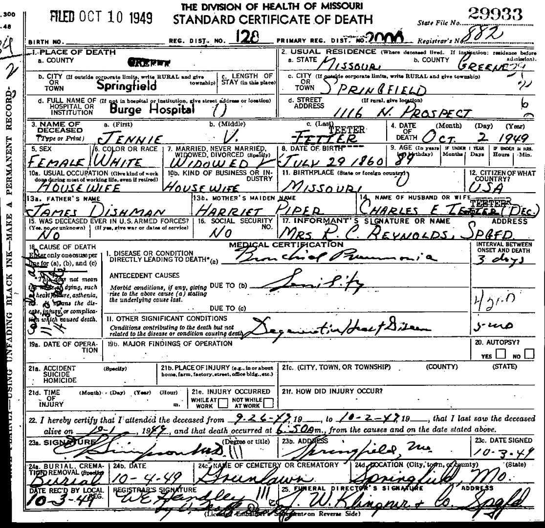 - [S967] Jennie V. Teeter, Certificate of Death no. 29933 (1949), Board of Health, Bureau of Vital Statistics.
