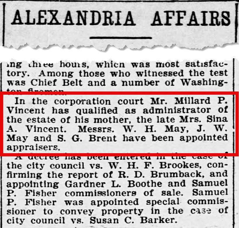 - [S969] "Alexandria Affairs,"Sina A. Vincent estate adminsitrator named, Evening Star, Washington, District of Columbia, 4 Oct 1906, p.12 (https://www.newspapers.com/image/146503731 : accessed 29 May 2025); citing Newspapers.com.