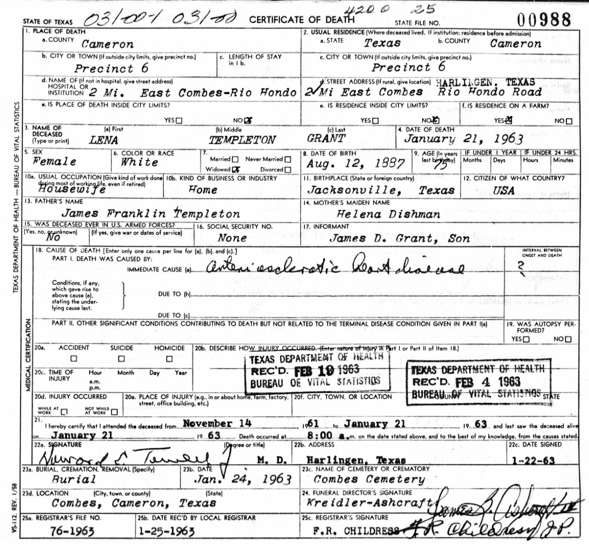 S0972--Death Cert--1963--Texas--Lena Templeton Grant