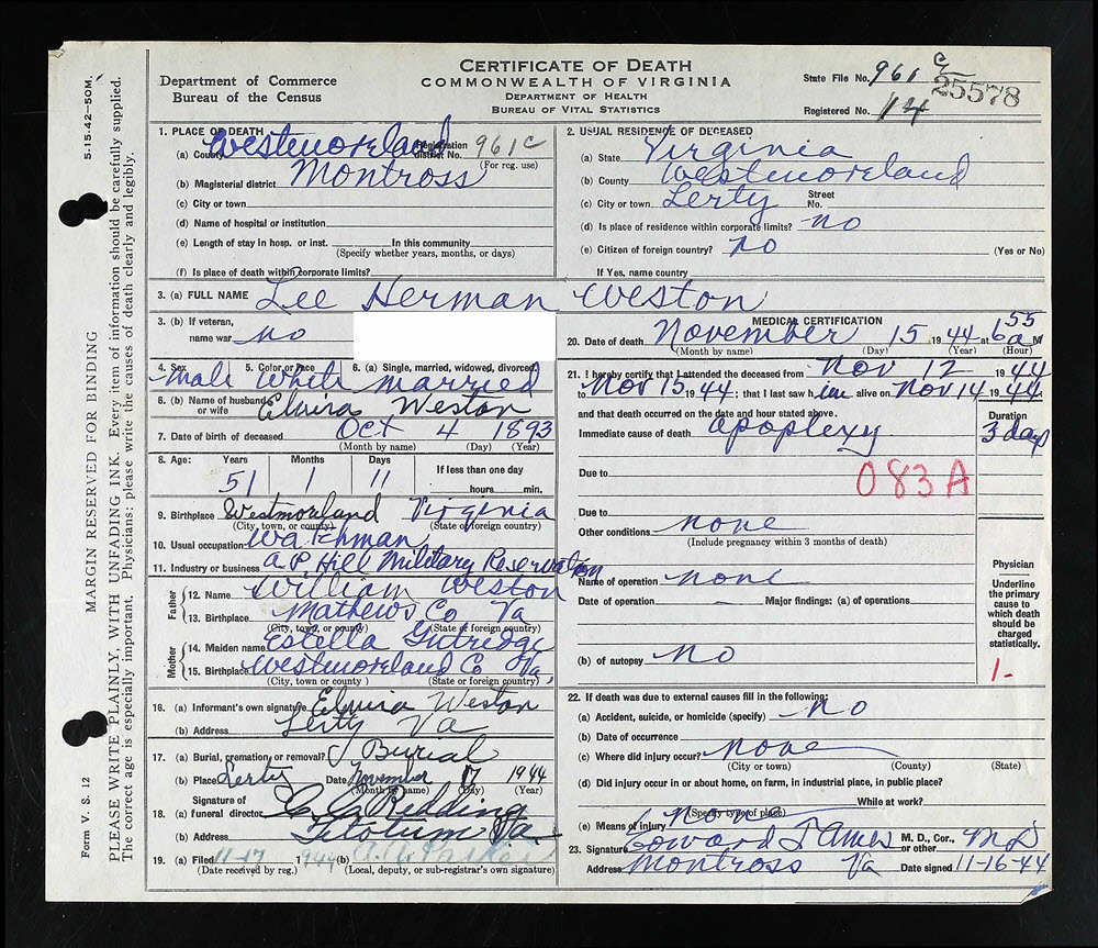 - [S983] Lee Herman Weston, Certificate of Death no. 25578 (1944), Department of Health, Bureau of Vital Statistics.