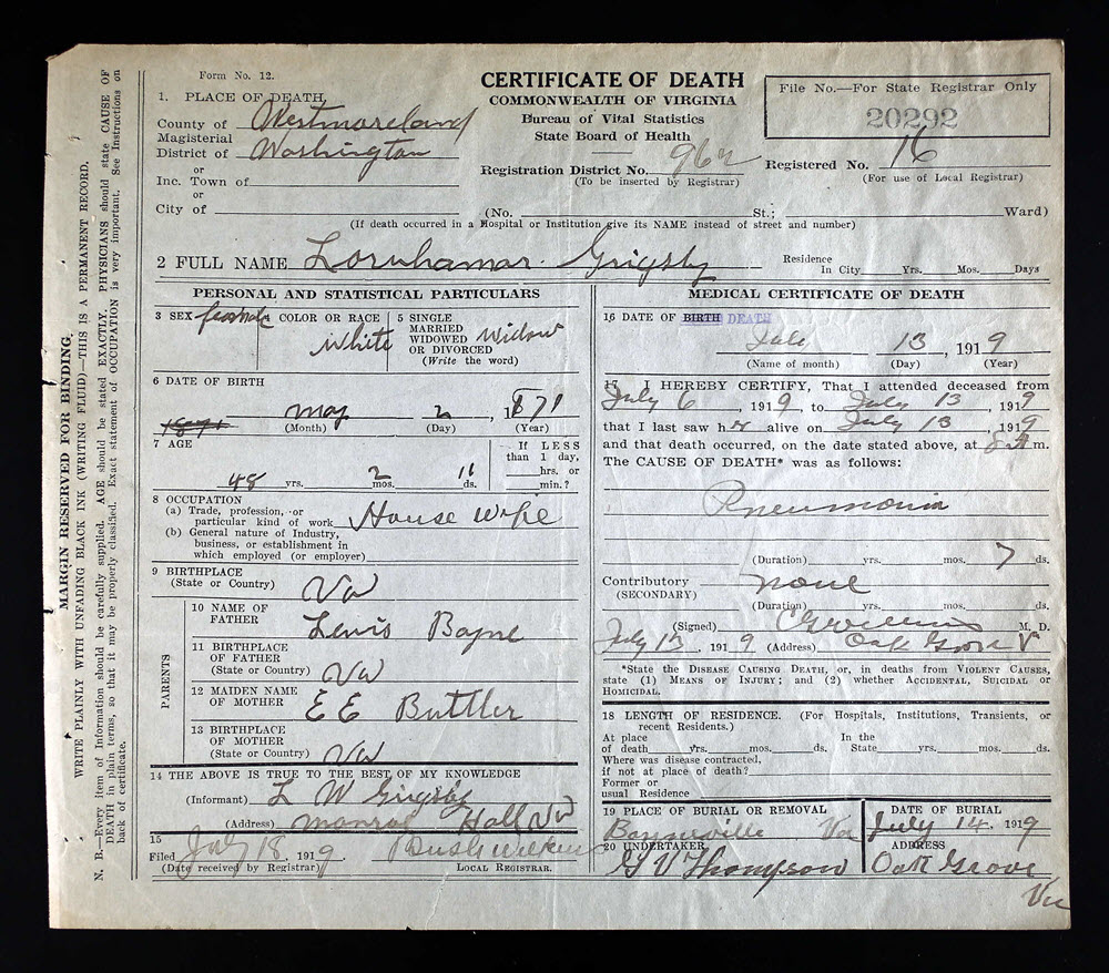 - [S986] Lornhamar Grigsby, Certificate of Death no. 20292 (1919), Department of Health, Bureau of Vital Statistics.