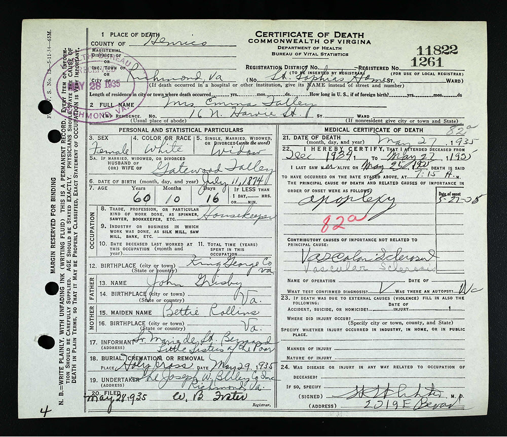 - [S987] Emma Talley, Certificate of Death no. 1261-11822 (1935), Department of Health, Bureau of Vital Statistics.