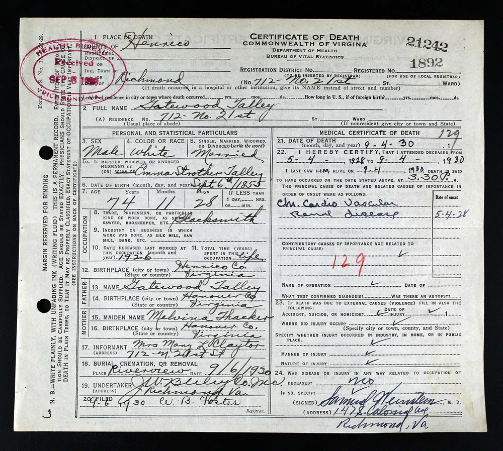 - [S988] Gatewood Talley, Certificate of Death no. 1892-21242 (1930), Department of Health, Bureau of Vital Statistics.
