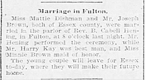 - [S757] "Marriage in Fulton,"Mattie Dishman and Joseph Brown marriage, Richmond Times-Dispatch, Richmond, Virginia, 21 Dec 1900, p.8 (https://www.newspapers.com/image/79929099 : accessed 29 May 2025); citing Newspapers.com.