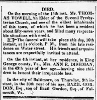 - [S762] "Died," John Dishman, Alexandria Gazette, Alexandria, Alexandria County, Virginia, 27 Sep 1843, p.3; citing Chronicling America.