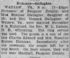 - [S782] "Virginia Weddings and Engagements,"Edgar Dishman and Beatrice Gallagher marriage, Richmond Times-Dispatch, Richmond, Virginia, 14 Nov 1929, p.5 (https://www.newspapers.com/image/827826103/ : accessed 27 May 2025); citing Newspapers.com.