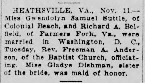 - [S803] "Virginia Weddings and Engagements,"Gwendolyn Suttle and Richard Belfield marriage, Richmond Times-Dispatch, Richmond, Virginia, 12 Nov 1923, p.5 (https://www.newspapers.com/image/827766960 : accessed 27 May 2025); citing Newspapers.com.