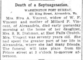 - [S817] "Death of a Septuagenarian,"Sira A. Vincent, The Washington Post, Washington, District of Columbia, 30 Sep 1906, p.13 (https://www.newspapers.com/image/28917176 : accessed 25 May 2025); citing Newspapers.com.
