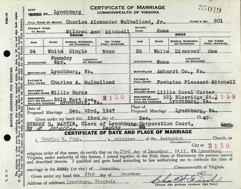 Charles Alexander Mulholland Jr and Mildred Ann Mitchell