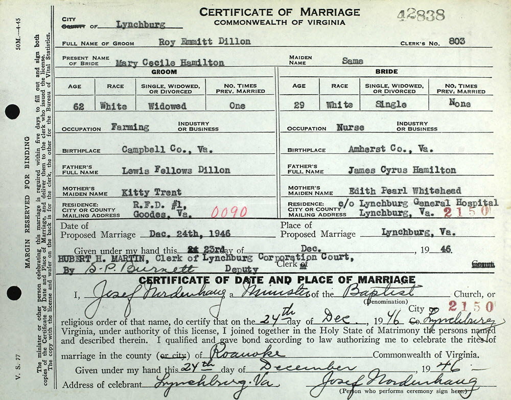 Roy Emmitt Dillon and Mary Cecile Hamilton