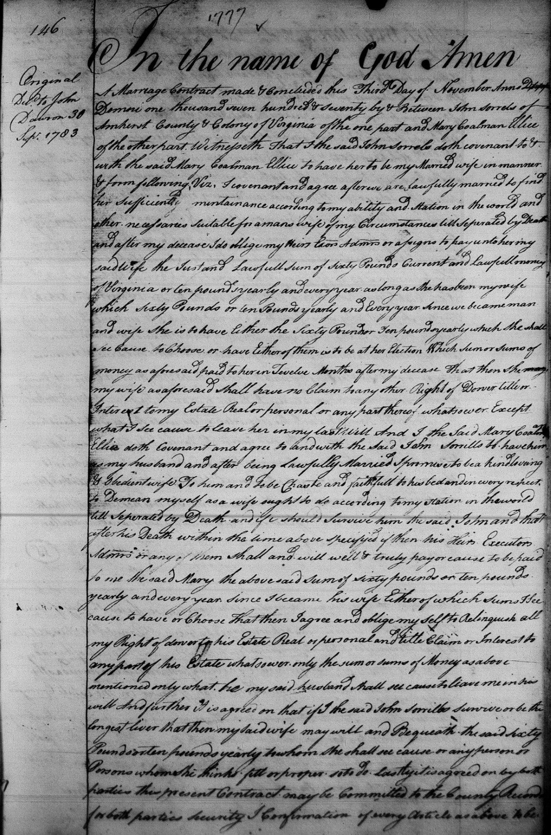 S1643--Marriage Contract--1770-11-03--Amherst Co VA-- -John Sorrell-Mary Coleman--p146