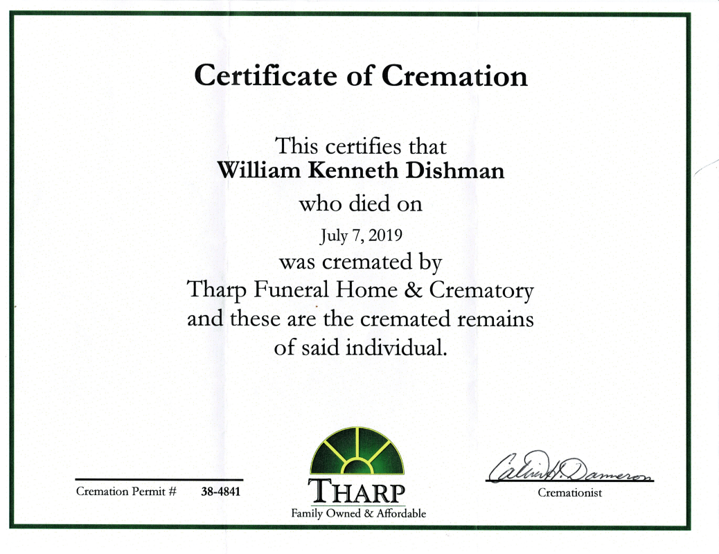 S1328 - Death Record - 2019-07-07 - William Kenneth Dishman Cremation certificate