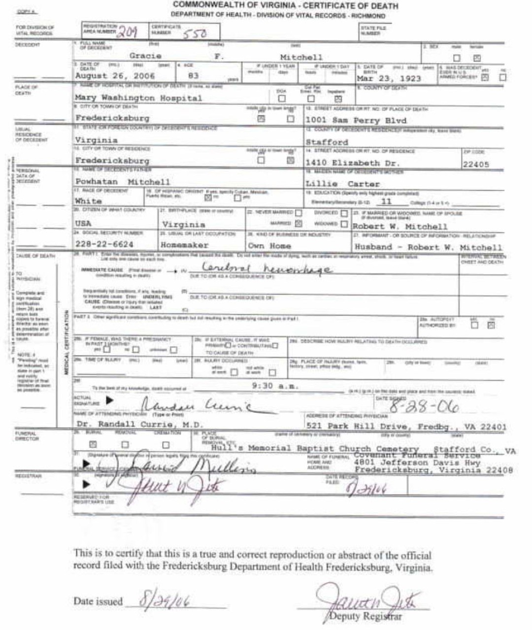 S0875--Death Cert--2006--Virginia--Gracie F Mitchell