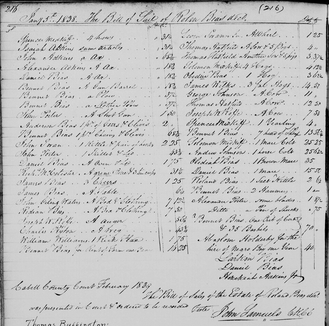 S1941--Inventory--1838--Cabell Co. Virginia--Rolen Bias--p216